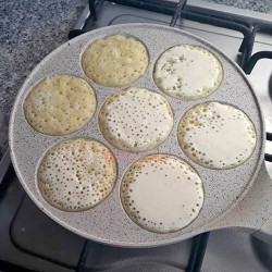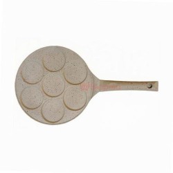 تتميز الأداة بمقلاة مسطحة دائرية مع سبع تجويفات ضحلة، مما يتيح لك طهي عدة بان كيك في وقت واحد. كل تجويف مصمم بحجم مثالي للبن كيك القياسي، مما يضمن طهيًا متساويًا وامتصاصًا مثاليًا للنكهة. مصنوعة من مادة فاتحة اللون، ربما غير لاصقة، تضمن هذه المقلاة سهولة إخراج البان كيك بينما تعزز التسخين المتساوي على السطح.
