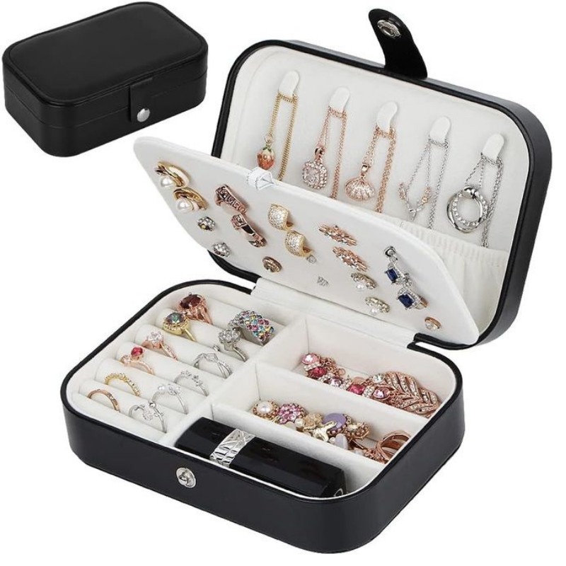 احتفظ بمجموعتك من المجوهرات منظمة بشكل جميل مع هذا الصندوق الأسود الأنيق، المثالي للخواتم، والأقراط، والقلائد.