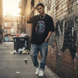 يجمع تي شيرت جرافيك أسد حضري بين الراحة والأناقة، مما يجعله إضافة مثالية لأي خزانة ملابس غير رسمية. مصنوع من قماش عالي الجودة، يتميز بتصميم أسد ملون يبرز، مثالي للتعبير عن الفردية والأناقة.