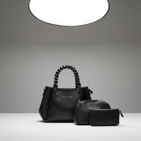 This elegant handbag set includes a stylish black handbag, a matching purse, and a compact pouch. Crafted from high-quality materials, this set is designed for both functionality and style, making it a perfect choice for everyday use or special occasions.