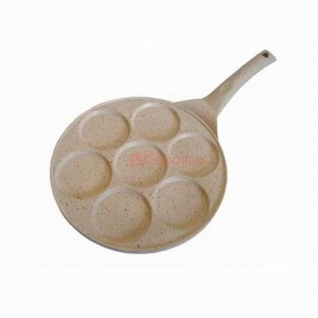 The utensil features a round, flat pan with seven shallow indentations, allowing you to cook multiple pancakes simultaneously. Each indentation is perfectly sized for standard pancakes, ensuring even cooking and optimal flavor absorption. Made from a light-colored, possibly non-stick material, this pan guarantees easy release of your pancakes while promoting even heating across the surface.